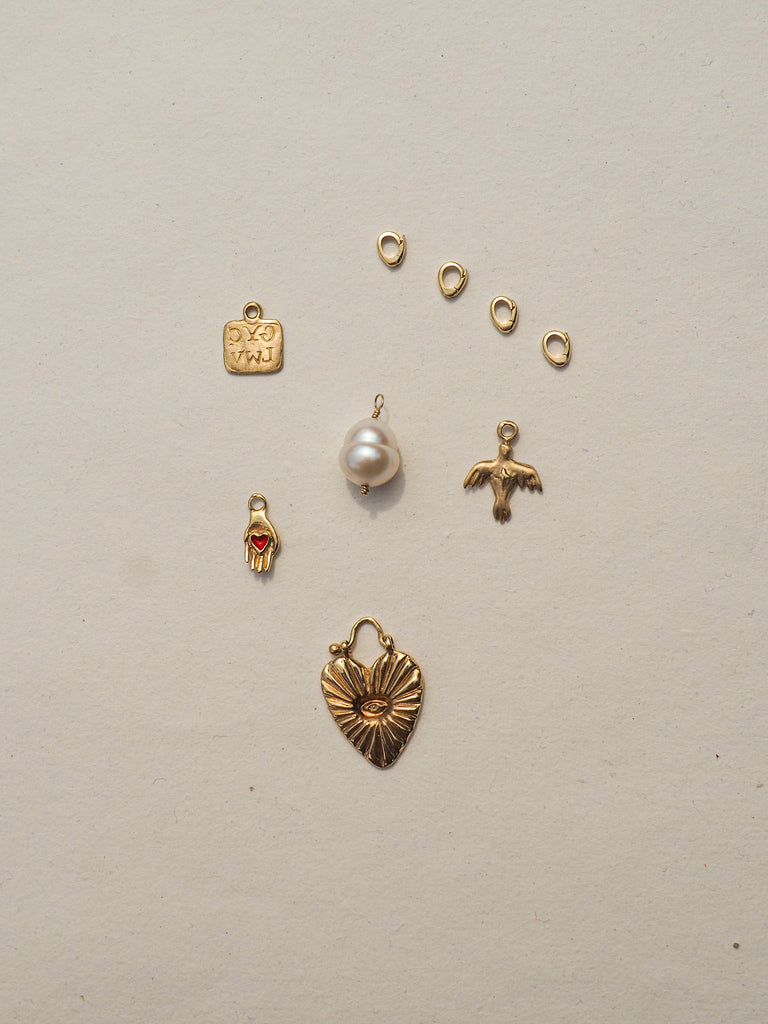 A thick, fine metal heart connector with a delicate seeing eye hand-carved into the center with light rays emulating from every angle. The connector features two small hoops and a hook at its top.