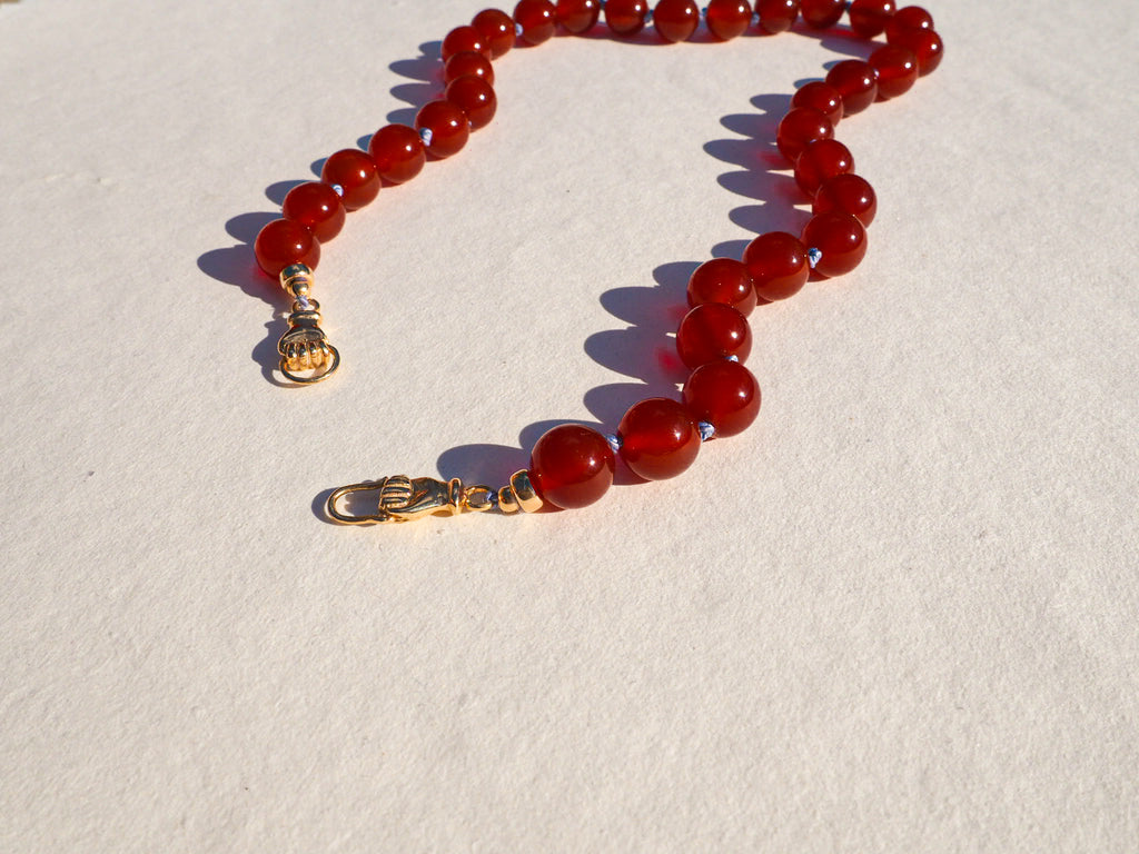 Strand of individually hand-knotted 10mm carnelian beads on 100% periwinkle pure silk thread, complemented by fine metal accents. Clasp and beads are solid 14K yellow gold or sterling silver. Available in 16" and 18" lengths.