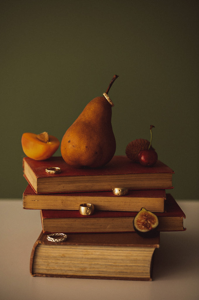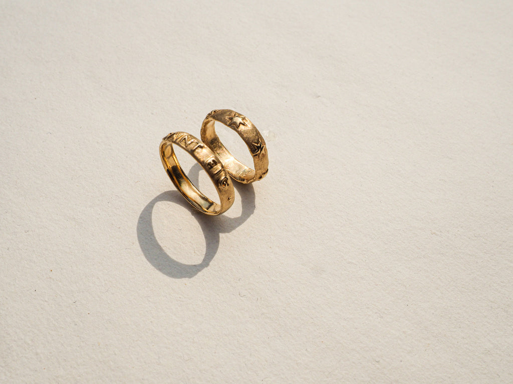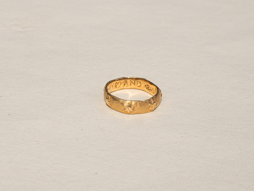 An organically shaped infinity band of six-point stars. A special note is hand carved on the ring’s interior, for you or your lover to know in secret. Let it be a reminder that the most important things in this life are often those that cannot be seen.
