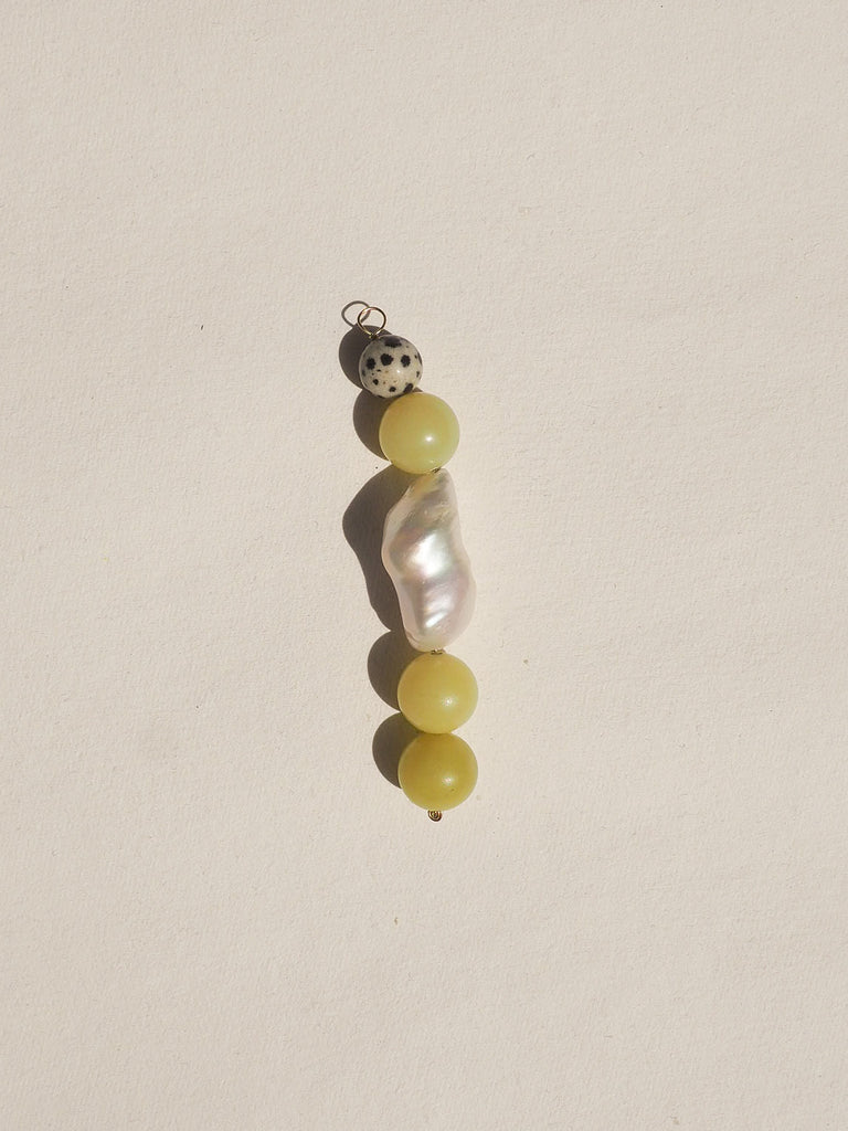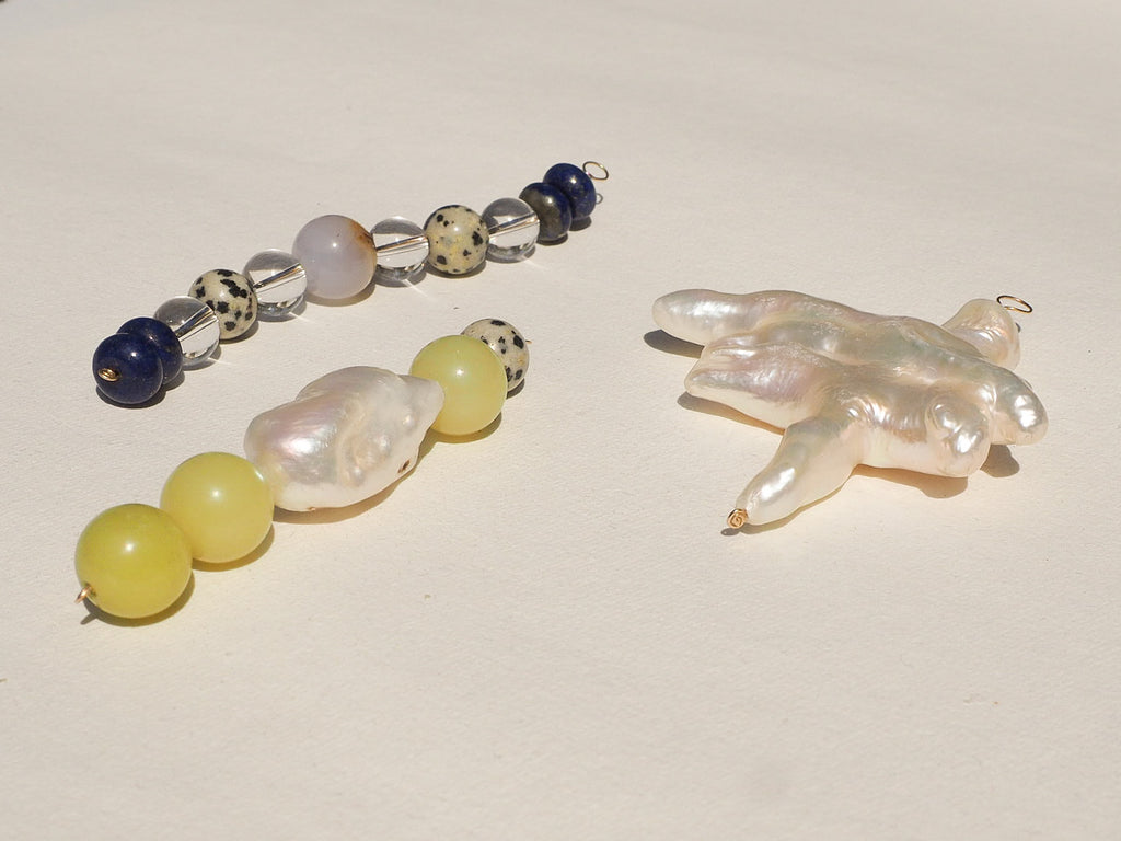 Lemon Jade & Biwa Pearl: A pairing of sun-warmed stone and lustrous pearl, balancing matte and iridescent surfaces in a quietly surrealist gesture.