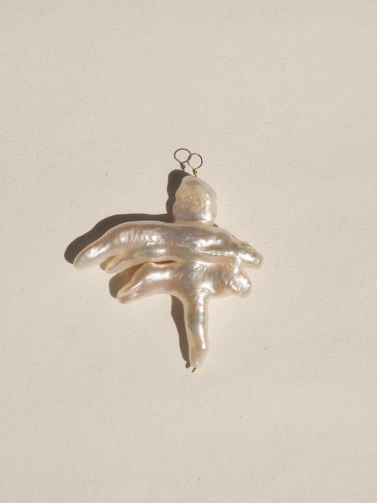 Biwa Pearl: Elongated and organic, the pearl’s irregular silhouette catches light in shifting planes — a soft counterpoint to the collars’ structured geometry.