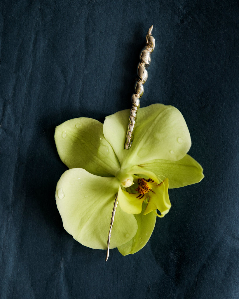Evocative of ancient sea relics and surrealist forms, this brooch captures the soft spiral of a shell in a structured, polished silhouette. Designed to be worn in the hair or styled as a pin, it shifts fluidly between function and ornament. Tactile, elemental, and quietly striking — a sculptural accent grounded in natural rhythm.